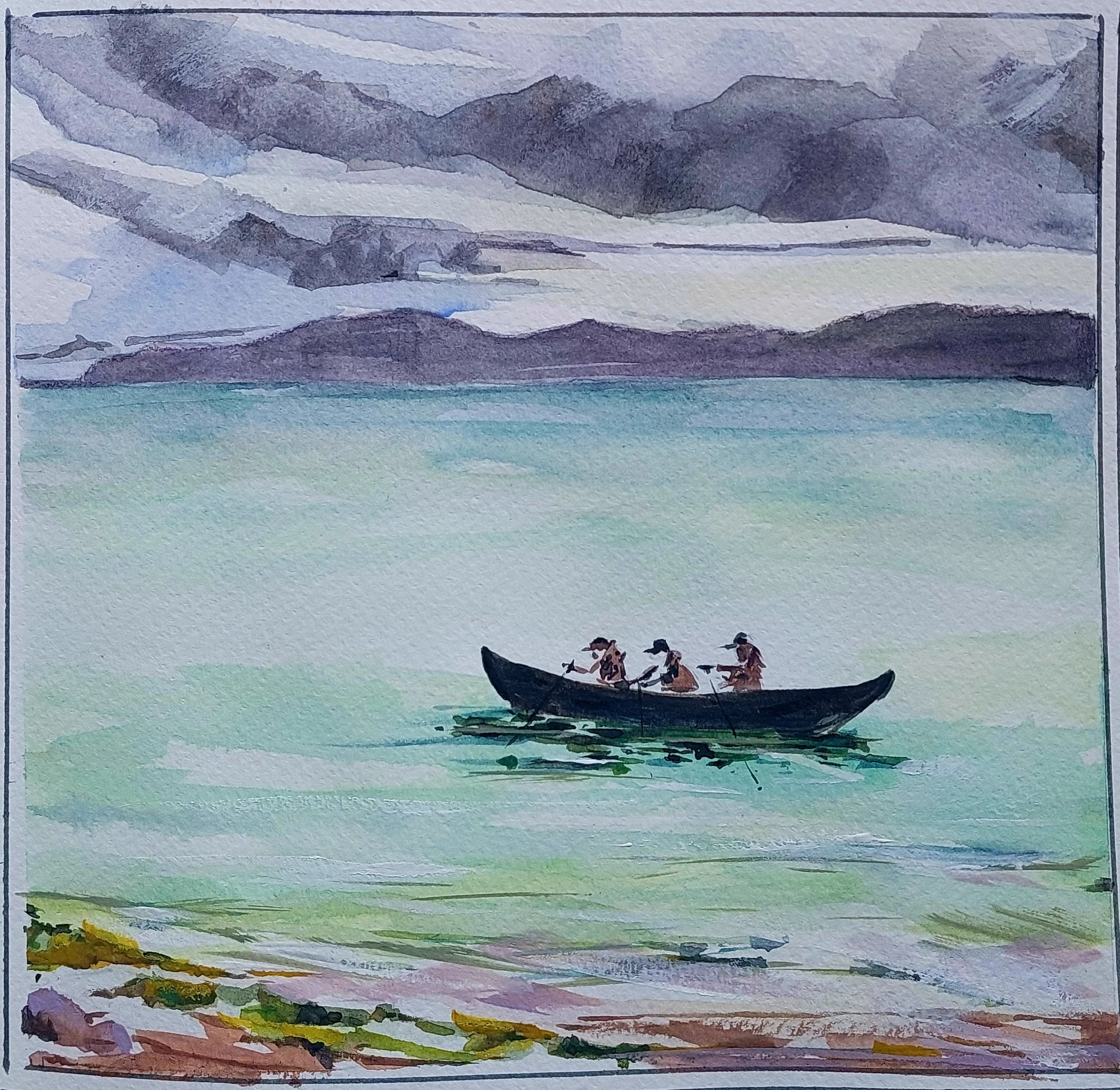 Watercolour painting capturing a traditional currach being rowed ashore to the beach at Inis Mor on the Aran Islands on Irelands west coast.