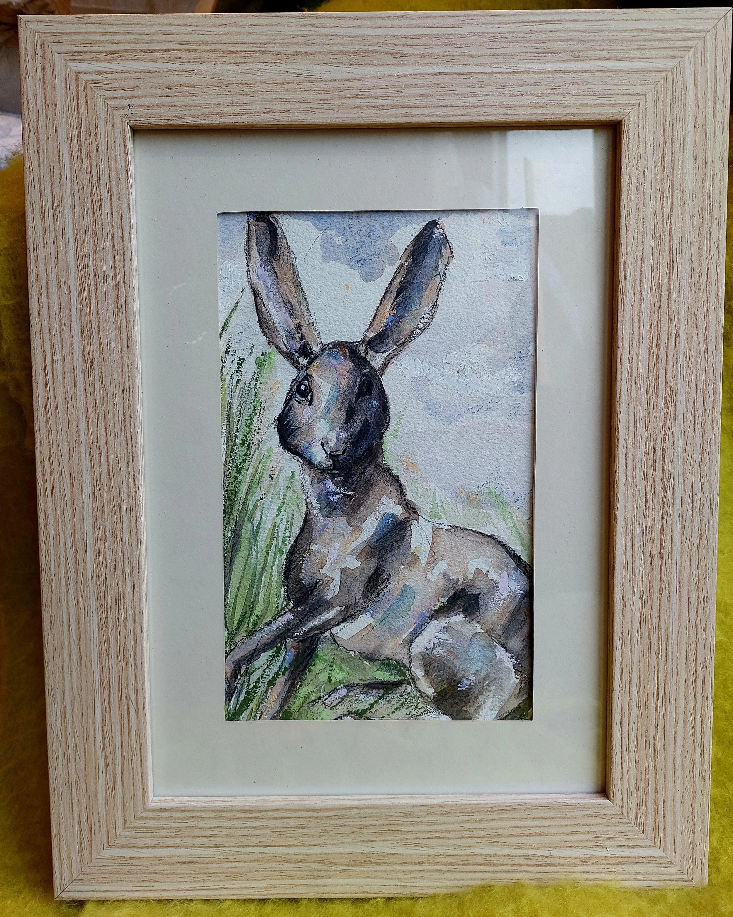 Framed, original, watercolour painting of a hare sitting in long summer grass. He has one paw raised, his large dark eyes are fixed on the viewer, ready to disappear. Blink and you will miss him.